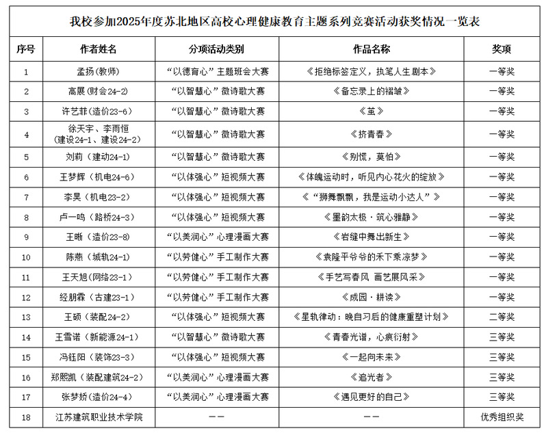 9月19日,江苏省苏北地区大学生心理健康教育研究中心公布2025年苏北高校大学生心理健康教育主题系列竞赛获奖名单,我校共获17个奖项,其中一等奖12项、二等奖1项、三等奖4项,同时新宝gg蝉联优秀组织奖。其中,我院财会24-2班高展同学的《备忘录上的褶皱》获得“以智慧心”微诗歌大赛中一等奖。