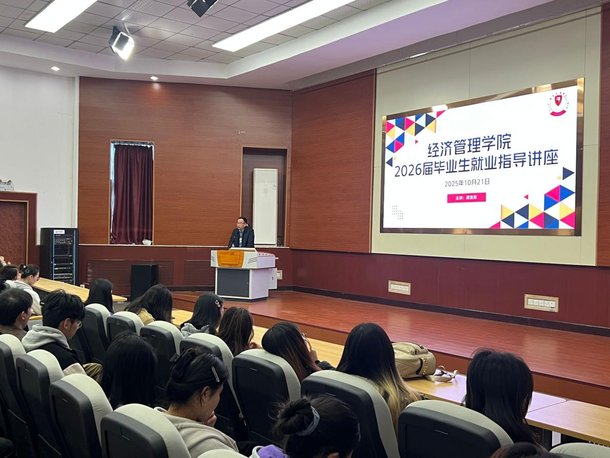 姜主任结合当前宏观经济环境,深入分析了经管类专业的就业现状与未来趋势。他指出,在产业结构升级与数字化转型背景下,金融、数据分析、供应链管理等领域需求旺盛,但竞争也日趋激烈。他建议学生立足专业优势,通过行业调研和职业测评,尽早明确“专业+兴趣+市场需求”三位一体的职业定位。