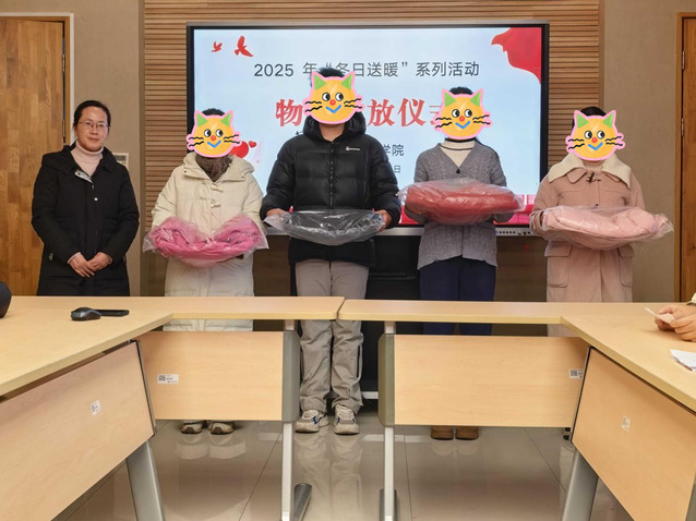 活动伊始,许琳老师为同学们详细介绍了“冬日送暖”系列资助政策。随后进入温暖传递环节——物资发放仪式。李国琴、崔廷锋和许琳分批为受助学生送上寒衣、爱心大礼包及生活用品礼包,并与同学们亲切合影。一份份物资满载关爱,既抵御了严寒,也寄托着学院对学生的深切关怀与期望。